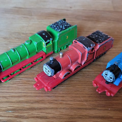 Det er 2 forskjellige varianter, med bilder av alle sider på togene. Selges kr.30.- pr.stk+kr.69.-postens porto.