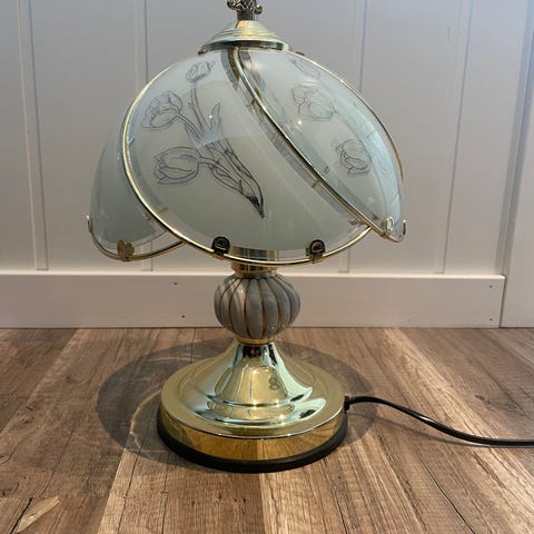 Vakker bordlampe i gylden messing (?) og glass. Ant. fra 80-tallet. Tung og solid.