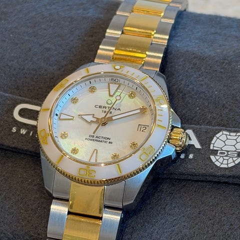 Med en diameter på 39 mm gjør den anerkjente DS PH200M en meget fin figur på ethvert håndledd. Elegant perlemor, keramikk og diamanter er perfekt supplert med favoritt (ikke-)fargen til fashionistaer over hele verden, samt en stropp laget av bærekraftig materiale. Dens ultramoderne automatiske kaliber og en vanntetthet på 200 meter sørger for at denne klokken kan skilte med både presisjon og kraft. I tillegg kan den vise til en gangreserve på imponerende 80 timer.