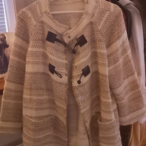 Nesten ikke brukt flott bluse/tunika i nydelige farger er desverre for stor for meg og har bare blitt hengende I skapet. Fine detaljer og splitt på armene. Står ikke str på den men vil passe en str 46-48.