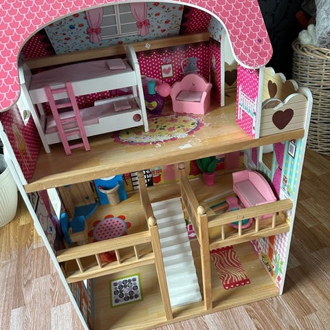 Stort dukkehus selges med noe møbler. Ca 120 cm høyt