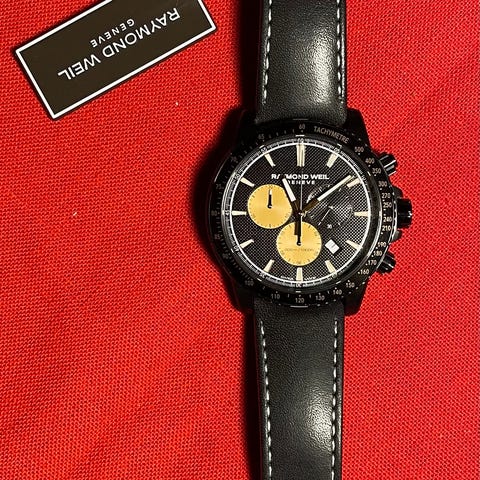 Har for salg av minr Raymond Weil klokker, 18k goldplated. Klokka er ubrukt og ligger i orginal eske m papirer, merkelapp fortsatt festet på klokka. Herre modell. Flott dress klokke f.eks. Selges grunnet en litt for stor samling klokker og blir derfor ikke brukt.