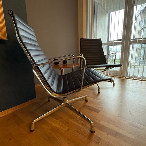 Denne er i Premium Leather i en fantastisk farge som vist på bildene med svart pulverlakkert understell. En fantastisk stol med tilhørende pall.