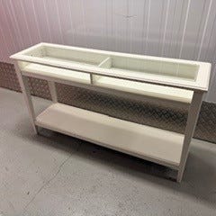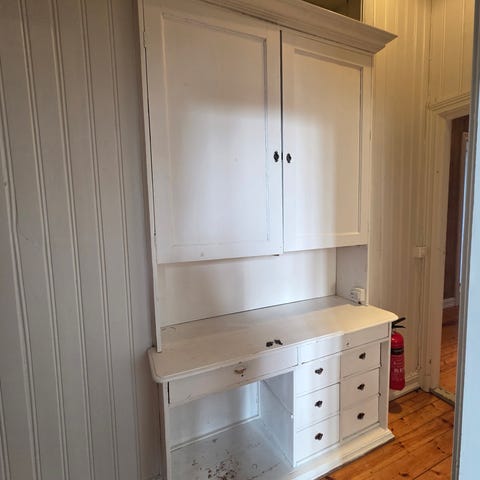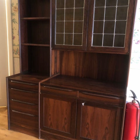 3 hyller bak blyglassene og 2 «doble» skap