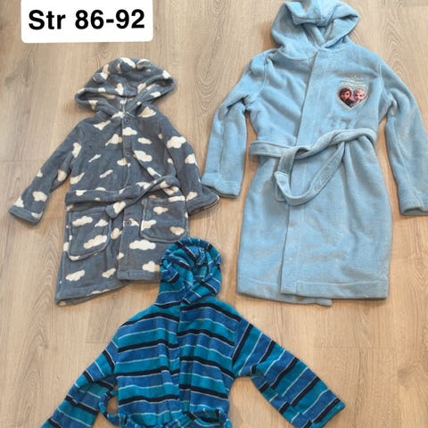 Morgenkåper i str 86/92, 98/104 og 134/140 (SOLGT) selges kr 80 per stykk. Pent brukt av et barn. Sendes mot porto.