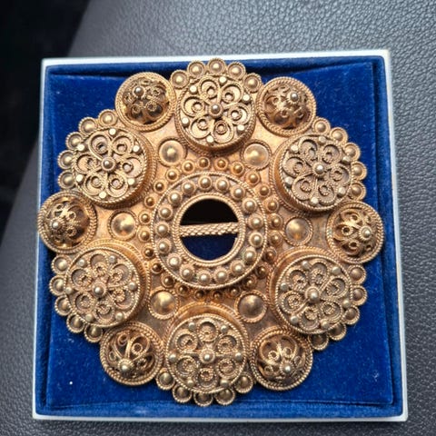 Nydelig sølje…bole søljen er fra 1950 tallet ca. 9 cm i diameter. Mye er håndlaget mulig alt , jeg veit ikke sikkert. Vært hos gullsmed, han sa verdi er 20 000kr. Salgsverdi 15000kr. Det er skrevet 830 S to steder bak. Den er brukt til Vest Telemarks bunad fram til 1975 og ble brukt til Øst Telemark fram til 2020. Gullsmeden sa jeg måtte ikke selge den for under 15000kr. Flere bilder kan ev sendes på pm. Jeg sender ev som Norgespakke for da er den forsikret. Jeg kan betale ev porto