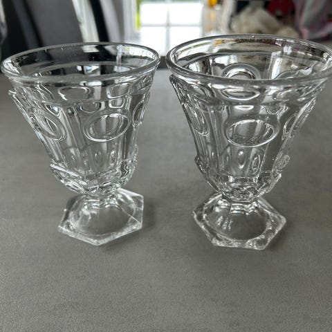 Fine eldre likør/dram glass med slipt mønster. 4 stk selges samlet kr 150,-.