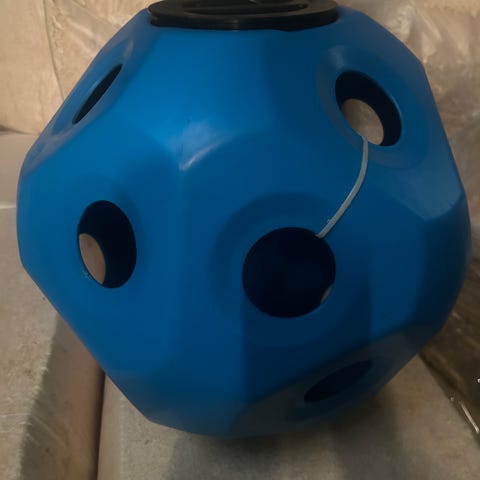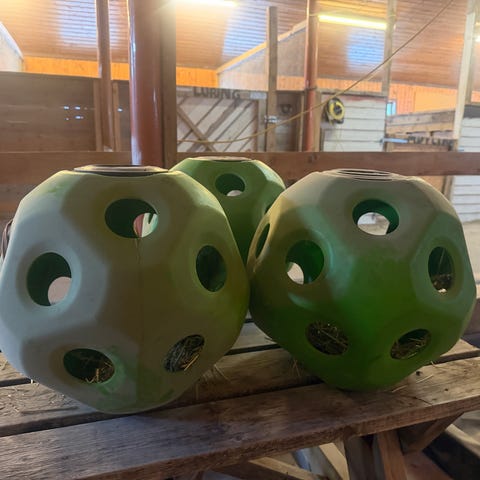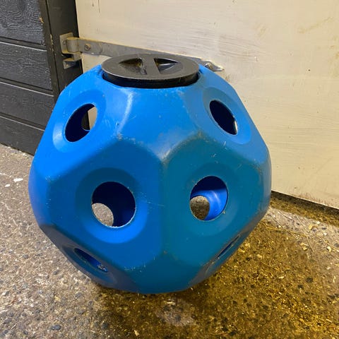 Sfærisk høyball (slow feeder) bestående av 32 flater. Ballen ruller forsiktig rundt mens hesten spiser. Bevegelsen gjør at hesten underholdes og må arbeide litt for maten. Dette reduserer også svinn på høyet.