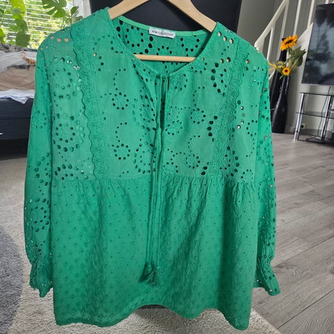 Flott bluse i delikat grønnfarge. Faller utrolig fint. Figursnill med strikk nederst. Ubetydelig brukt. Selges rimelig. Str M