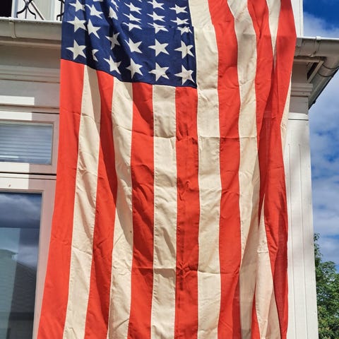 Helt nytt amerikansk flagg. Aldri brukt. Kjøpt på Oslo Flaggfabrikk. Håndsydd. 225cm langt. Passer til 6-8 meter stang. Eller på vegg. Meget pent. Fiks Ferdig! Spar porto - se også mine andre annonser.