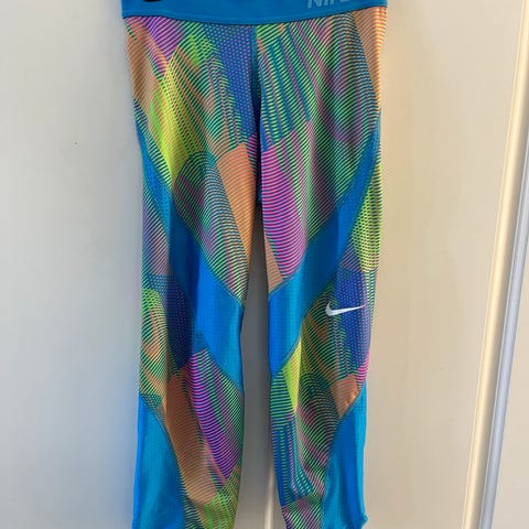 Blå mønstret Nike treningstights størrelse S. Tightsen er brukt men mye bruk igjen. Modellen på bildet bruker normalt XS mot S. Kan sendes mot at kjøper betaler porto.