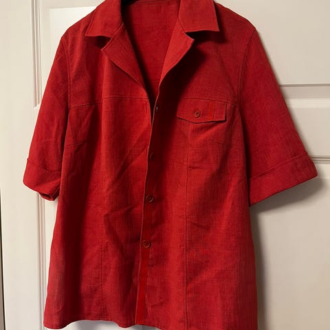Morsom krinklet skjorte fra More & More, størrelse 42. Mønster foran og på kragen, hvit bak på rygg og ermer. 35% bomull, 65% pol. Fine perlemorsknapper. Bryst 108 cm lengde 62 cm