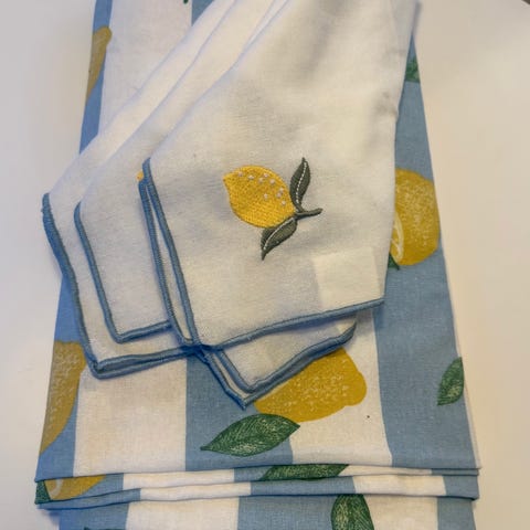 Duken har hvitt mønster på brun bunn, serviettene er hvite med brunt mønster i det ene hjørnet. Størrelse duk: 135x160 cm. Duken har et firkantet, brunt felt i midten (88x58 cm) hvor det er brodert fem hvite blomster. Størrelse serviett: 38x40 cm. Prisen er for duk og servietter. Duken og serviettene har aldri vært i bruk, men er innkjøpt for en del år tilbake. Trolig kjøpt på Kanariøyene.