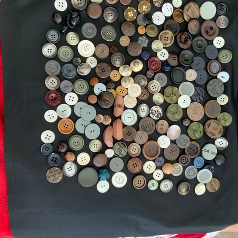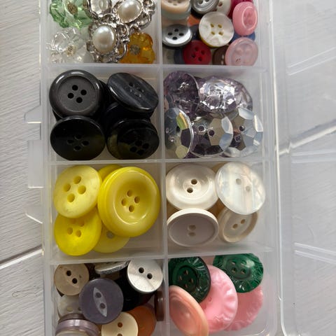 Sypakke med diverse restevarer. Stoff til vest, sikkerhetsnål, knapper i alle farger og former, silkebånd, skråbånd og strikk.