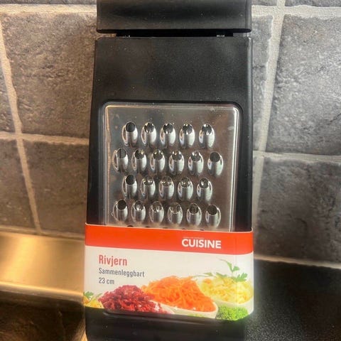 Rivjern fra med ulike rivemønstre på hver side. Fire rivjern i et: Grove strimler, medium strimler, fine strimler og skiver.