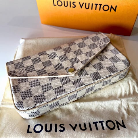 Mønsteret er lekkert med Damier Azur i bunnen og fine detaljer i gull og rosa. Beige farge innvendig.