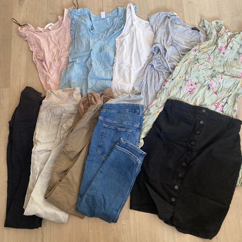 Pent brukt gravidpakke med gravidklær i str. S-M selges. Passer til vår/sommer. Mamaklær ble kun brukt i et svangerskap.