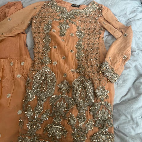 Selger indisk/pakistansk kjole som kun er brukt et par ganger i forbindelse med fester. Lagd i India. Nydelige detaljer på overdelene.