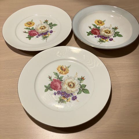 Flora servise fra Porsgrunn selges. Arvet fra familie, vet ikke historien eller hvor gammelt det er.