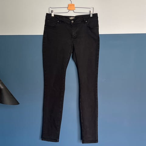 Buksen er i solid jeansstoff. Det er litt stretch i stoffet, som gjør den behagelig, men ikke så mye at den blir slaskete. Veldig pen og knapt brukt. Så her får du bukse som er som ny til en rimelig penge.