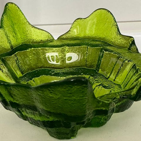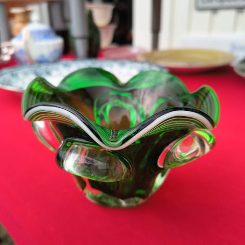 Unik, engelsk skål i glass med grønne og hvite ruter. Handkerchief Bowl. Hørt noen bruke Skjorteskål eller tørkleskål på norsk. Merket er Chance glass, «member of the PILKINGTON group”. Ingen skår, krakkelering eller nagg. Kjempegod stand! Vil tro den er fra 60- 70 tallet.