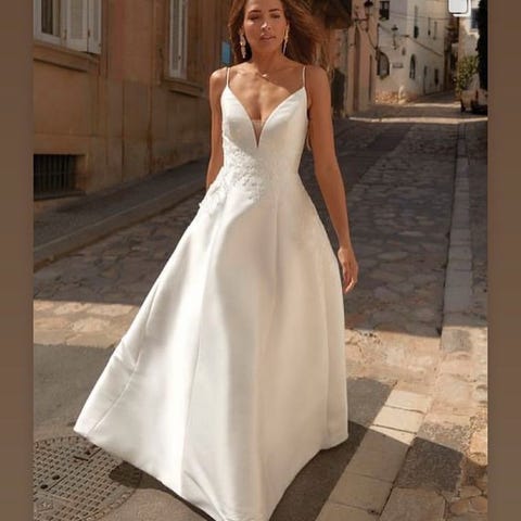 Kjolen ble kjøpt ny på Kristins brudesalong i Oslo i 2021, og deretter brukt én gang i mai 2022. Kjolen er laget av mikadosilke og fremstår av høy kvalitet. Kjolen er enkel og klassisk, men gjør allikevel mye ut av seg med sitt flatterende snitt og fasong. Størrelsen og lengden på kjolen er tilpasset meg av skredderen til Kristins brudesalong. Jeg er ca str medium og er 1,74 m høy (+ ekstra lengde til sko). Kjolen selges med underskjørt som også er størrelse medium.