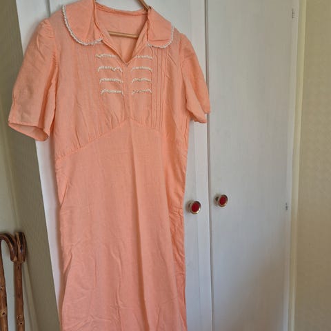 Enkel fin retro kjole i blankt gult stoff. Strl 38, men er nok mer 36 (S) i størrelsen. Laget i Danmark.