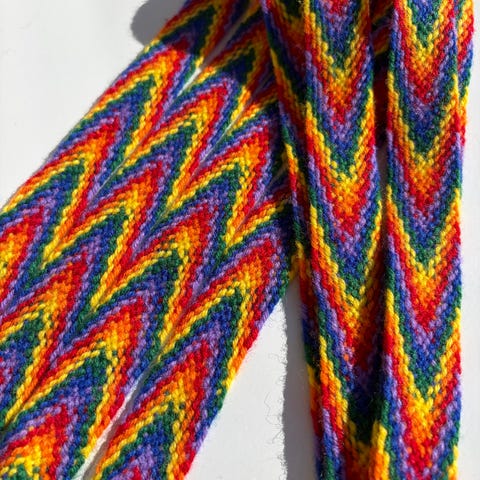 92 cm lengde + dusk utan strekk på banda. Banda vert 10-20 cm lengre alt etter kor mykje ein strammar. Fletta i tretrådsgarn frå Rauma ullvarefabrikk.