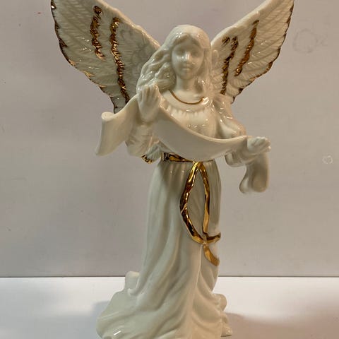 Nydelig hvitmalt engel laget i gips, dekorert med delikate gulldetaljer i håret, på vingene, kransen og kjolen. En vakker figur som passer perfekt til både helårsdekor og julepynt.