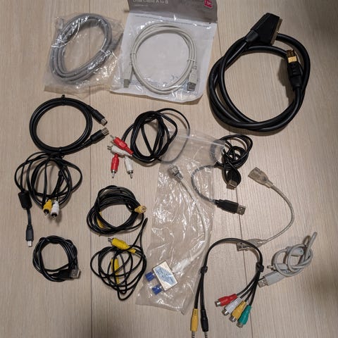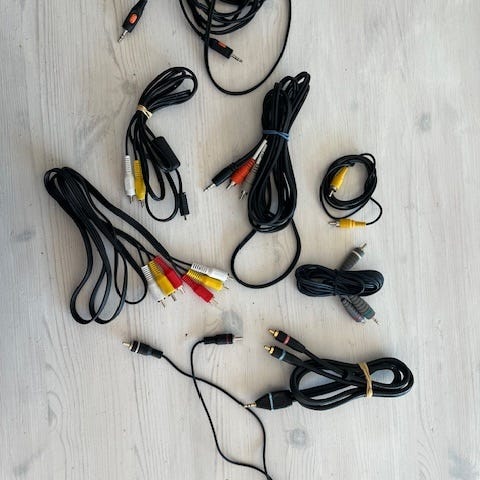 Ulike stereo- og videokabler inkludert HDMI- og Scart-kontakt for video og DVD.