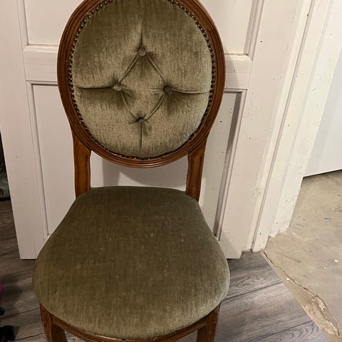 Stolene ble gitt til oss, så vi aner ikke alder, produsent på de. Fremstår håndlaget, med god kvalitet. Stoffet er helt og pent, og stolene er gode å sitte i. Bud over 300 vurderes.