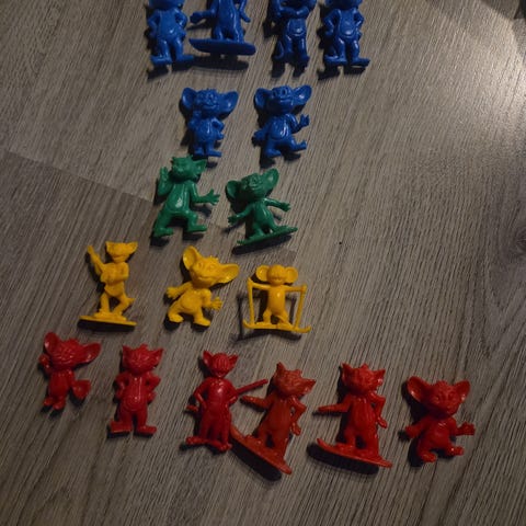 Selges kún samlet. Spørsmål om enkelt figurer vil ikke bli besvart. Her har du fargevarianter av f.eks en Jerry figur i dyp og lys gul, og Jerry med tynn og tykk fiskestang. Se bilder. Selges samlet kr.250.-+70.-frakt.