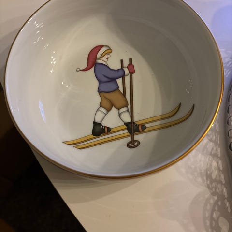 Pen, åttekantet skål/bolle fra Bing & Grøndahl, merket 335. Diameter ca 19 cm. Høyde 4 cm. Motiv heter Julerose, men jeg synes denne bollen passer vel så bra på sommerbordet. Selges for hbo kr 100.