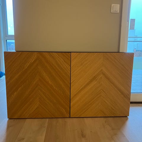 Skjenk i tre med svart overflate, utstyrt med tre skuffer og to skapdører. Skjenken har metallhåndtak og ben i svart. Egnet for oppbevaring i stue eller spisestue.