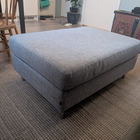 Flott puff fra Bolia Scandinavia med ullstoff i en gammelrosa farge med 15 cm ben i svartbeiset oljet eik. Puffen har oppbevaringsrom. Originalprisen er 10 500,- Legger ved bilder av originalen i gammelrosa og bilder fra nettsiden i grå. Samme stoff,bare ulik farge.