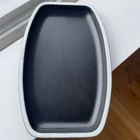 Vintage emaljefat i serien «Strek» produsert av Cathrineholm. Dette er en bedriftsgave regner jeg med, siden det står «Gunnar Strand & Co» på baksiden. Står dette i stedet for Cathrineholm-stempelet som bruker stå. Blank i emaljen. Noen nagg/litt rundt kantene, ellers normal bruksslitasje. (Se bilder) Selges derfor til redusert pris.