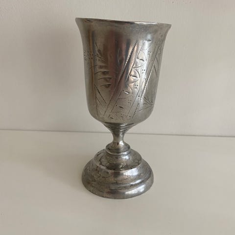 En antikk kopp i hvitmetall som har vært sølvbelagt( lite igjen)