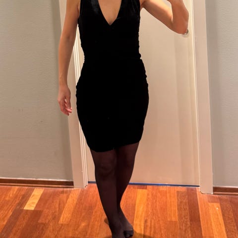 Mørk blå kjole i deilig mykt stoff med sorte blonde detaljer i front. Brukt 1 gang, fremstår som ny.