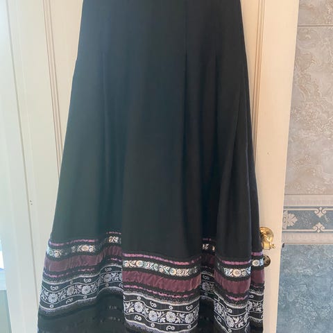 Skjørt i ull (str 40,lagt inn som passer 36) foret og pyntebånd rundt hele.