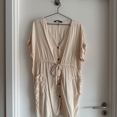 Kort, grå kjole / sommerkjole fra Topshop. Stor utringing, løstsittende overdel og strikk i livet - dette gir en «gresk gudinne»/tunika-look.