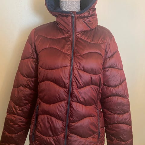 Lett og deilig boblejakke fra ONLY med hette. Lommer med knapper utenpå og åpne lommer på begge sider inni jakken. Fargen er en burgunderrød.