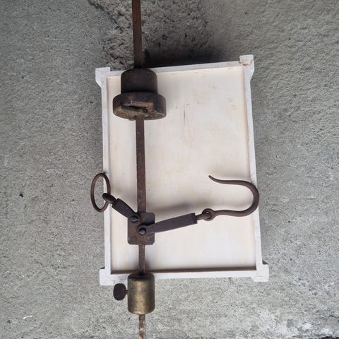 Gammel talje, samleobjekt, ca 130 år, ca 11 cm høy + krok og 5, 5 cm bred, selges for kr 300.