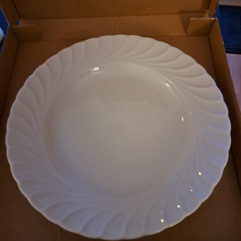 4 hvite tallerkener , to flate og to dype middagstallerkener