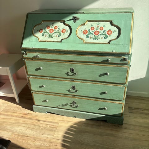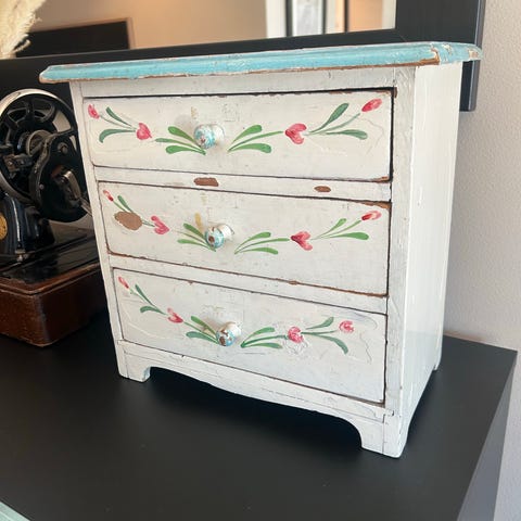 Denne lille kommode er perfekt for å lagre små gjenstander eller legge til en dekorativ aksent i ethvert rom. Ikke gå glipp av denne unike brikken med antikk sjarm!