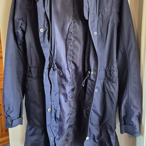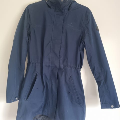 Jakken er pent brukt. Tåler regn.Store lommer. Hette.