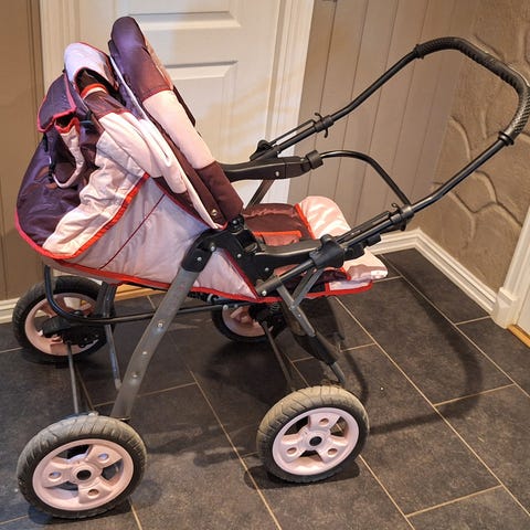 Følger med bag og sportsdel, regntrekk, stellebag i matchende farge, en mindre skinnveske til kortere turer, regntrekk til skinnveska og gulvbeskyttelse.