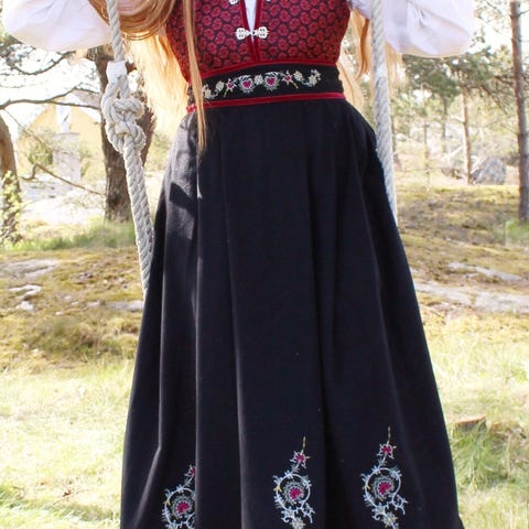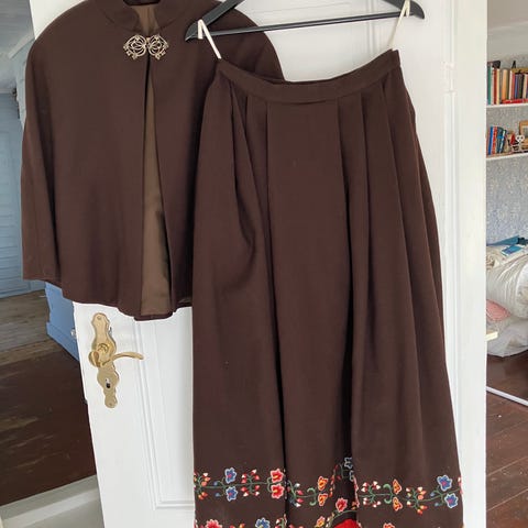 Lite brukt, str M, ikke slitt. Ny pris er ca kr 81000, sølv som følger med koster kr 17200. Skjorta har gulnet litt, men det går iflg. Husfliden å vaske bort.