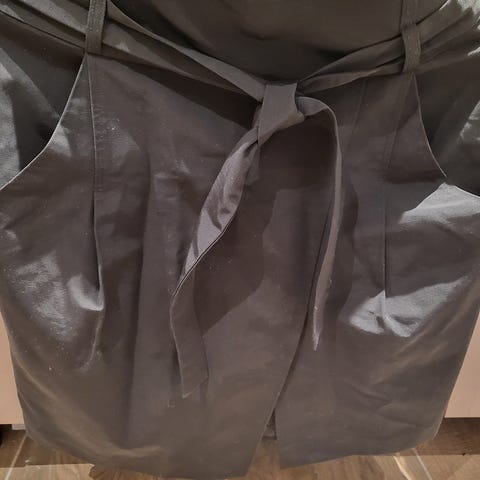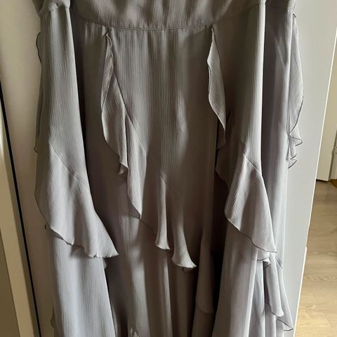 Lite brukt str L, estiske design Ivo Nikkolo. Fremstår som ny. Farge er sølvgrå med glans. Materialet: viskose men har silke liknende effekt, veldig stilig, stikklommer i sidene. Topp (silke og viskose) kan følge med hvis ønskelig.
