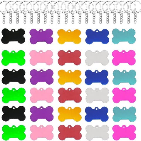 Gamle, ubrukte metallbrikker for gravering og montering på hundehalsbånd. 6 cm brede, 1,5 cm høye.