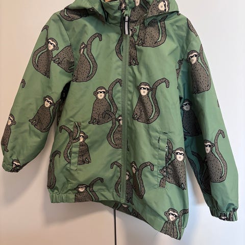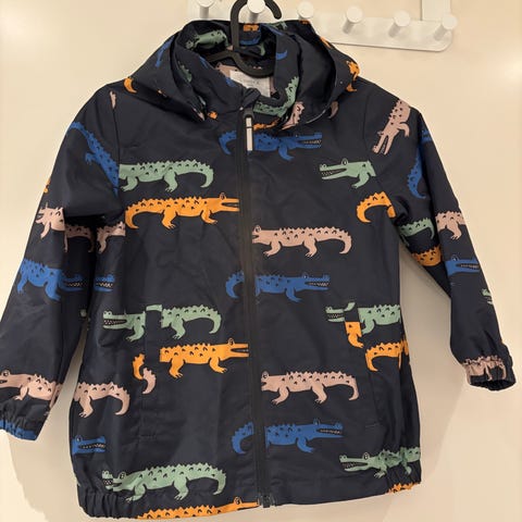 Dette er en kjempe fin regn jakke i størrelse 80 med motiv av krokodille på. Jakken har innvendig fleece som holder barnet varmt når det er regnig og litt kalde dager ute.